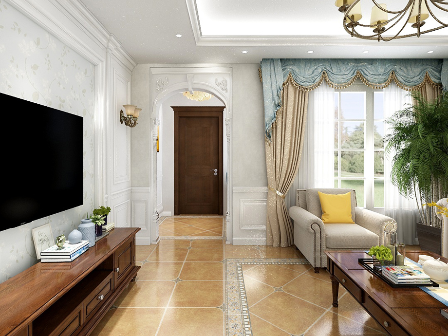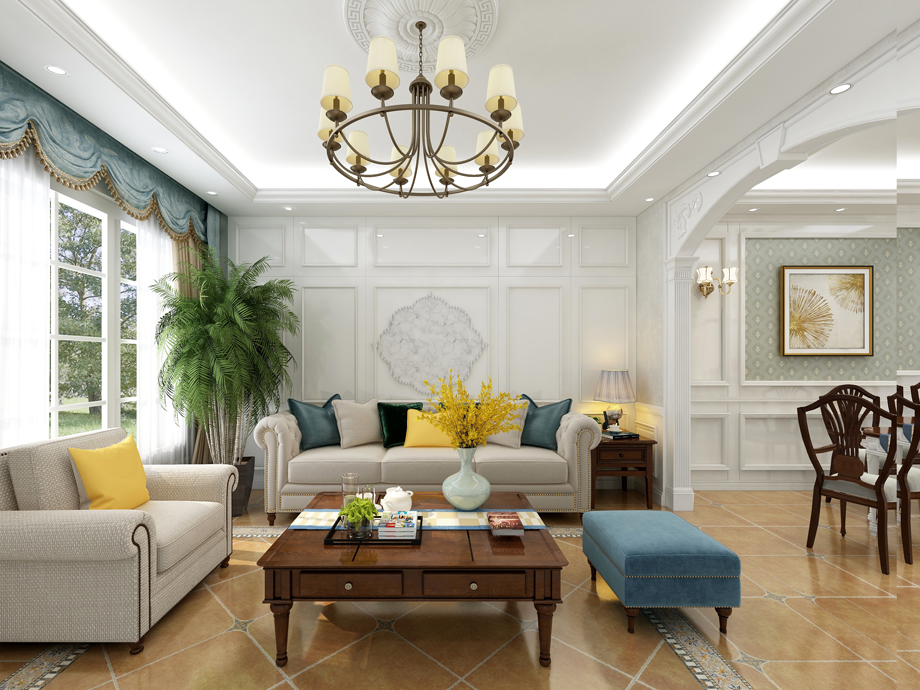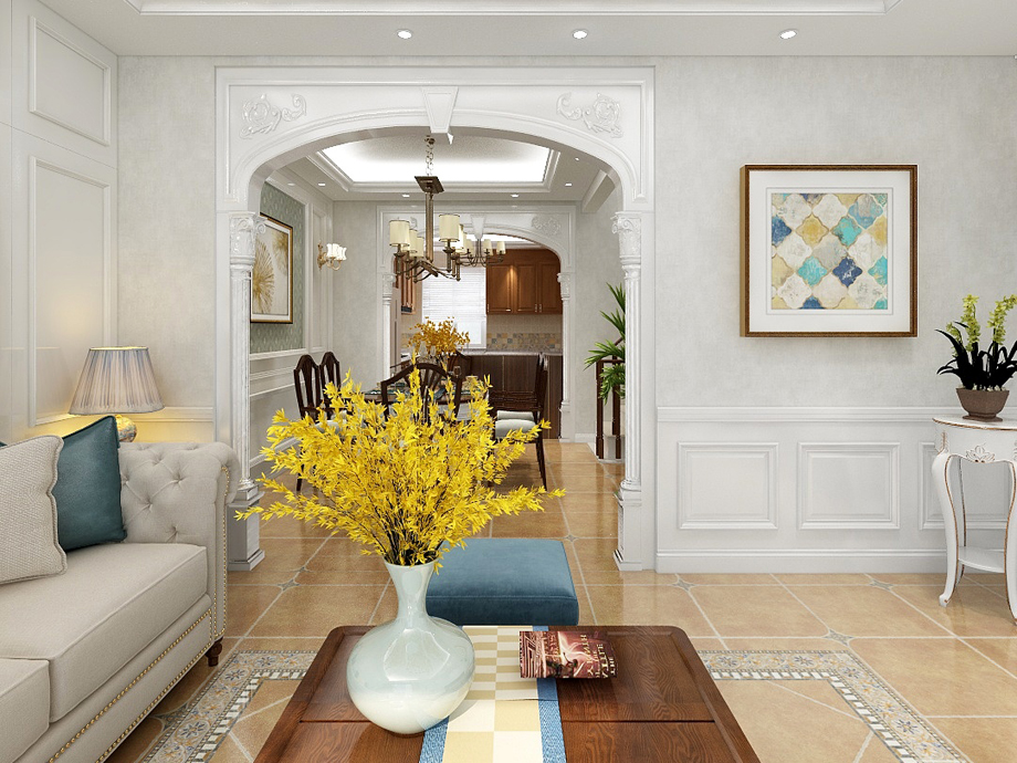 1、客廳:美式客廳風格較多采用嵌入式石膏吊頂,搭配精致的水晶吊頂,營造出一種懷舊、浪漫的感覺。以大理石作為地面裝飾材料,光澤感佳,在沙發(fā)區(qū)鋪上大幅花紋地毯,使空間區(qū)域劃分更加清晰。復(fù)古造型的組合沙發(fā),以及茶幾都具有上乘的質(zhì)感,讓美式古典風格得以進一步的彰顯。
