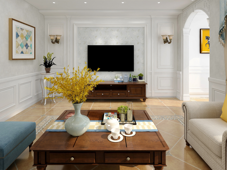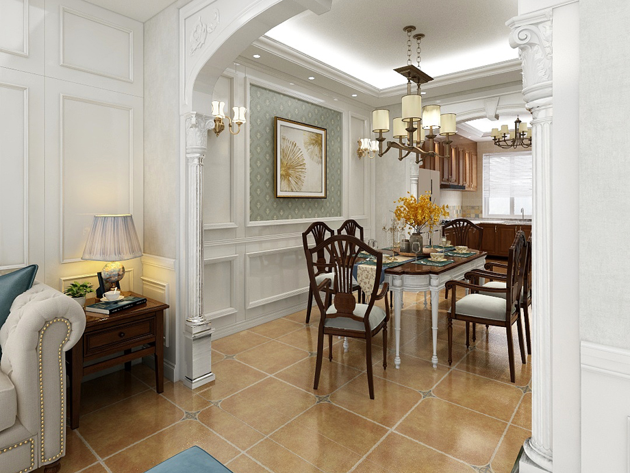 客廳作為待客區(qū)域,一般要求簡潔明快,同時裝修較其它空間要更明快光鮮,通常使用大量的石材和木飾面裝飾;美國人喜歡有歷史感的東西,這不僅反映在軟裝擺件上對仿古藝術(shù)品的喜愛,同時也反映在裝修上對各種仿古墻地磚、石材的偏愛和對各種仿舊工藝的追求上??傮w而言,美式田園風格的客廳是寬敞而富有歷史氣息的。