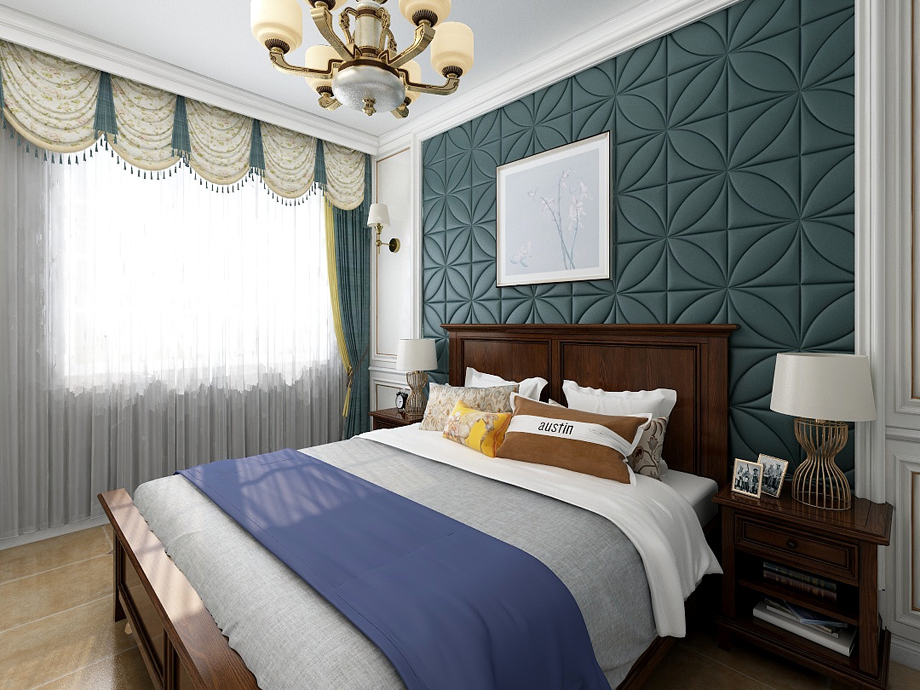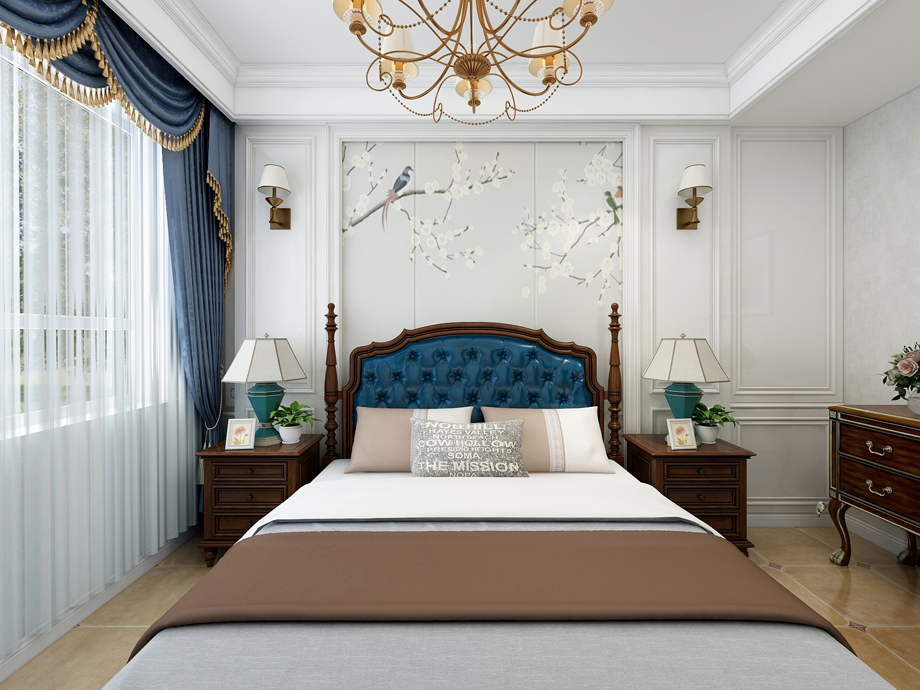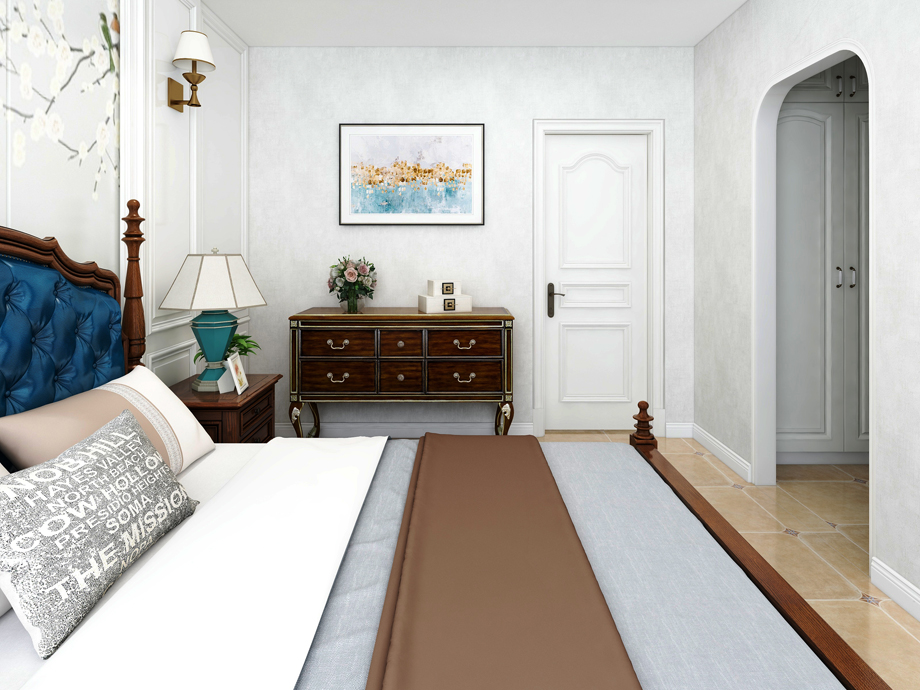 美式家居的臥室布置較為溫馨,作為主人的私密空間,主要以功能性和實用舒適為考慮的重點,一般的臥室不設(shè)頂燈,多用溫馨柔軟的成套布藝來裝點,同時在軟裝和用色上統(tǒng)一。
